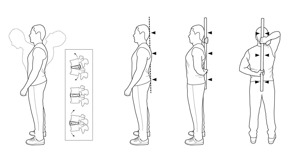 Рис 3. Нейтральное положение. На рисунке слева изменения формы межпозвонкового диска поясничного отдела в зависимости от положения тела. Справа показаны точки контроля нейтрального положения позвоночника и способ удержания гимнастической палки.